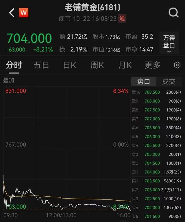 10月22日,香港恒生指数报收25781.77点,跌0.94%,恒生科技指数跌1.41%,报收5923.09点。黄金概念股普跌,老铺黄金跌超8%,灵宝黄金跌超4%。泡泡玛特涨2.4%。
