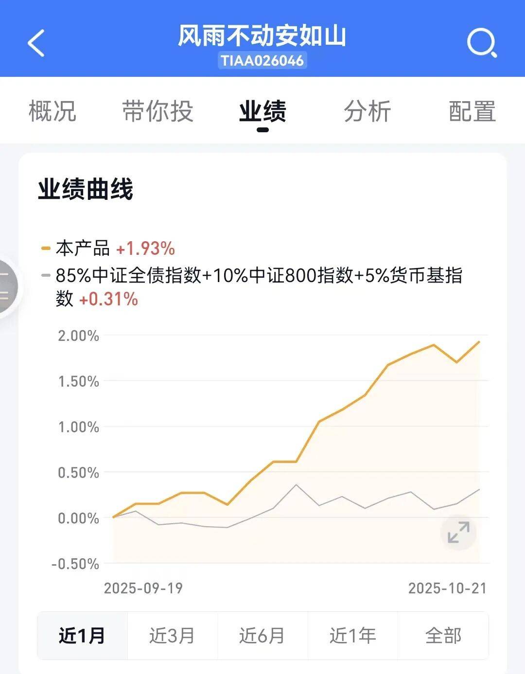 作为一个固收+组合,目标是在低波动下,跑赢存款。而1个月1.4%的收益相当惊人,赶得上存款一年的收益了。