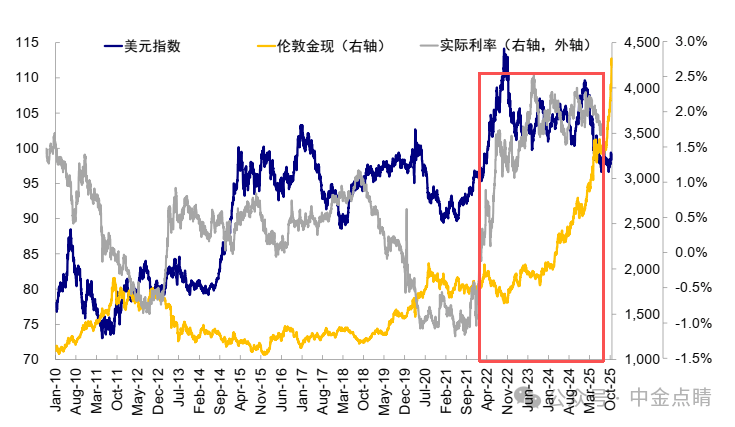 2022年之后,实际利率(灰线)保持在相对高位,但黄金(黄线)却持续暴涨。也就是上图红框中部分。
