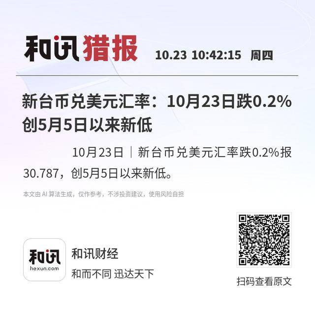 10月23日|新台币兑美元汇率跌0.2%报30.787,创5月5日以来新低。
