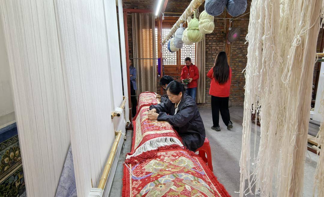 青灰瓦檐下,省级非物质文化遗产歧坪手工真丝地(挂)毯织造技艺代表性传承人刘华,向前来探访的代表们介绍技艺的保护传承与特色文创产品,眼中满是对这份手艺的骄傲与自豪。