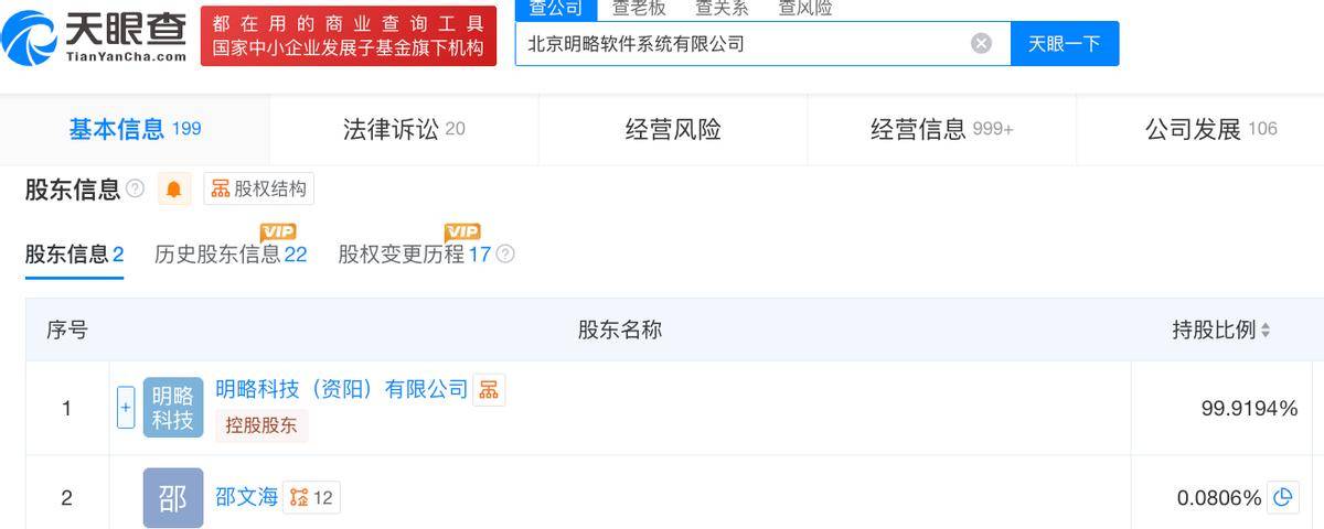 天眼查App信息显示,明略科技的主要经营主体为北京明略软件系统有限公司(简称“明略软件”),成立于2014年4月。目前,该公司的注册资本为1491.6808万元,法定代表人为宫载军,股东包括明略科技(资阳)有限公司、邵文海等。