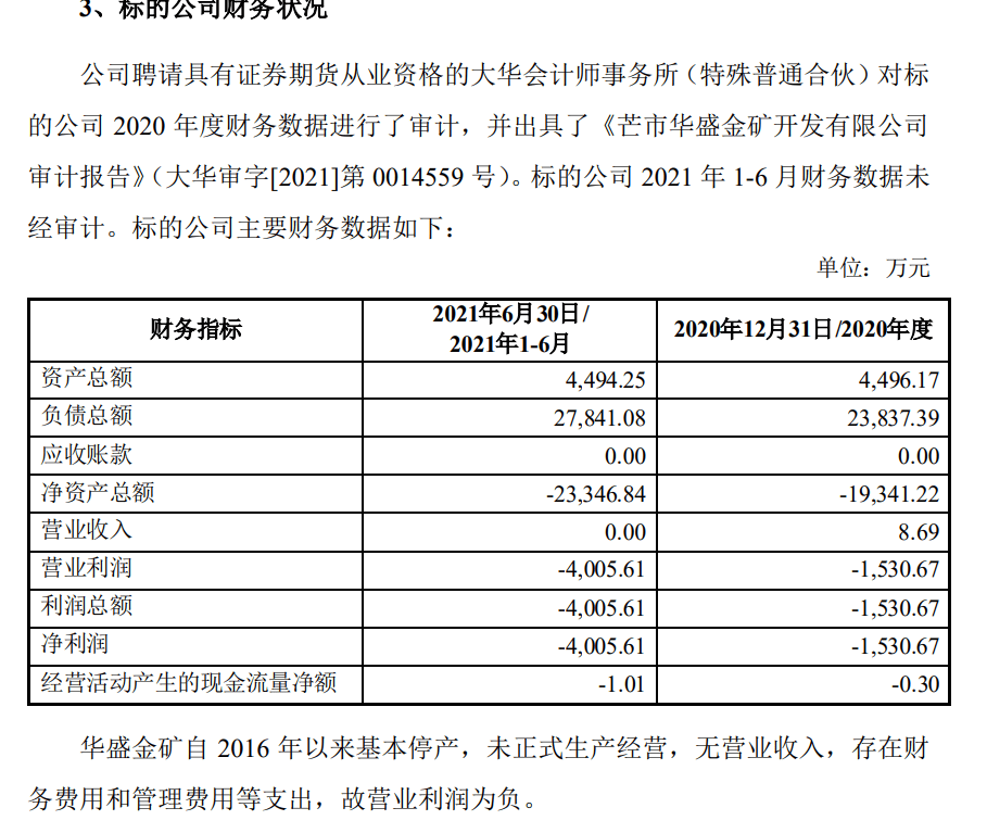 不过,山金国际或许也正为高溢价收购买单。2021年9月,山金国际以10.37亿元收购芒市华盛金矿60%的股份,华盛金矿是一座停产待恢复的金矿。据当时的公告,芒市华盛金矿2021年上半年营收为0元,净利润为-0.4亿元,截至当年6月底的净资产为-2.33亿元。以净资产算,此次收购可谓高溢价。