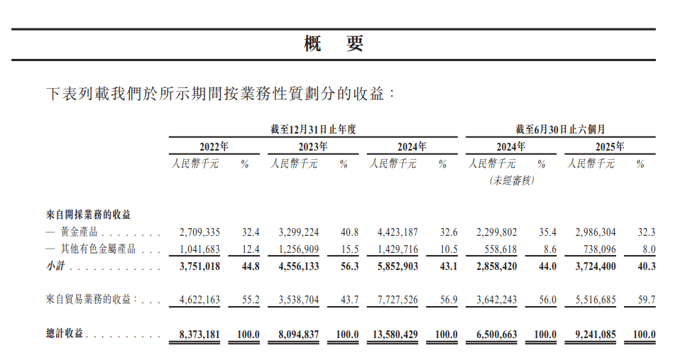 据申请版本,山金国际营收分为来自贸易业务和来自开采业务,报告期,公司贸易业务的营收分别为46.22亿元、35.39亿元、77.28亿元和55.17亿元,贸易业务常年维持在一半以上,近一年占比提升明显;受益于金价的上涨,黄金产品营收分别为27.09亿元、32.99亿元、44.23亿元和29.86亿元,而非黄金类的其他有色金属产品分别为10.42亿元、12.57亿元、14.29亿元和7.38亿元。