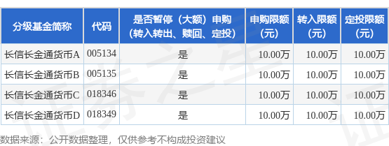 证券之星消息,10月27日长信基金管理有限责任公司发布《长信基金管理有限责任公司关于长信长金通货币市场基金暂停大额申购(含转换转入、定期定额投资)业务的公告》。公告中提示,为保护基金份额持有人的利益,根据《长信长金通货币市场基金基金合同》的有关规定,暂停长信长金通货币10万元以上的大额申购(含转换转入、定期定额投资)业务,自2025年10月28日起长信基金管理有限责任公司关于长信长金通货币市场基金暂停大额申购(含转换转入、定期定额投资)业务,下属分级基金调整明细如下: