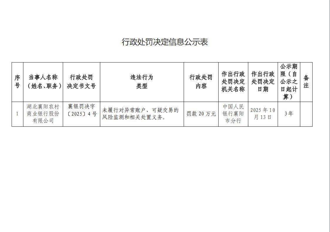 近日,中国人民银行襄阳市分行行政处罚决定信息公示表显示,湖北襄阳农村商业银行因未履行对异常账户、可疑交易的风险监测和相关处置义务,被中国人民银行襄阳市分行罚款20万元。