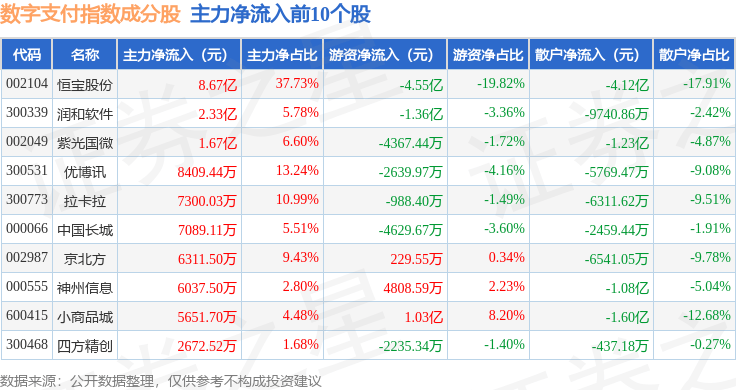 资金流向方面,数字支付(980113)指数成份股当日主力资金净流入合计15.17亿元,游资资金净流出合计5.16亿元,散户资金净流出合计10.02亿元。成份股资金流向详情见下表: