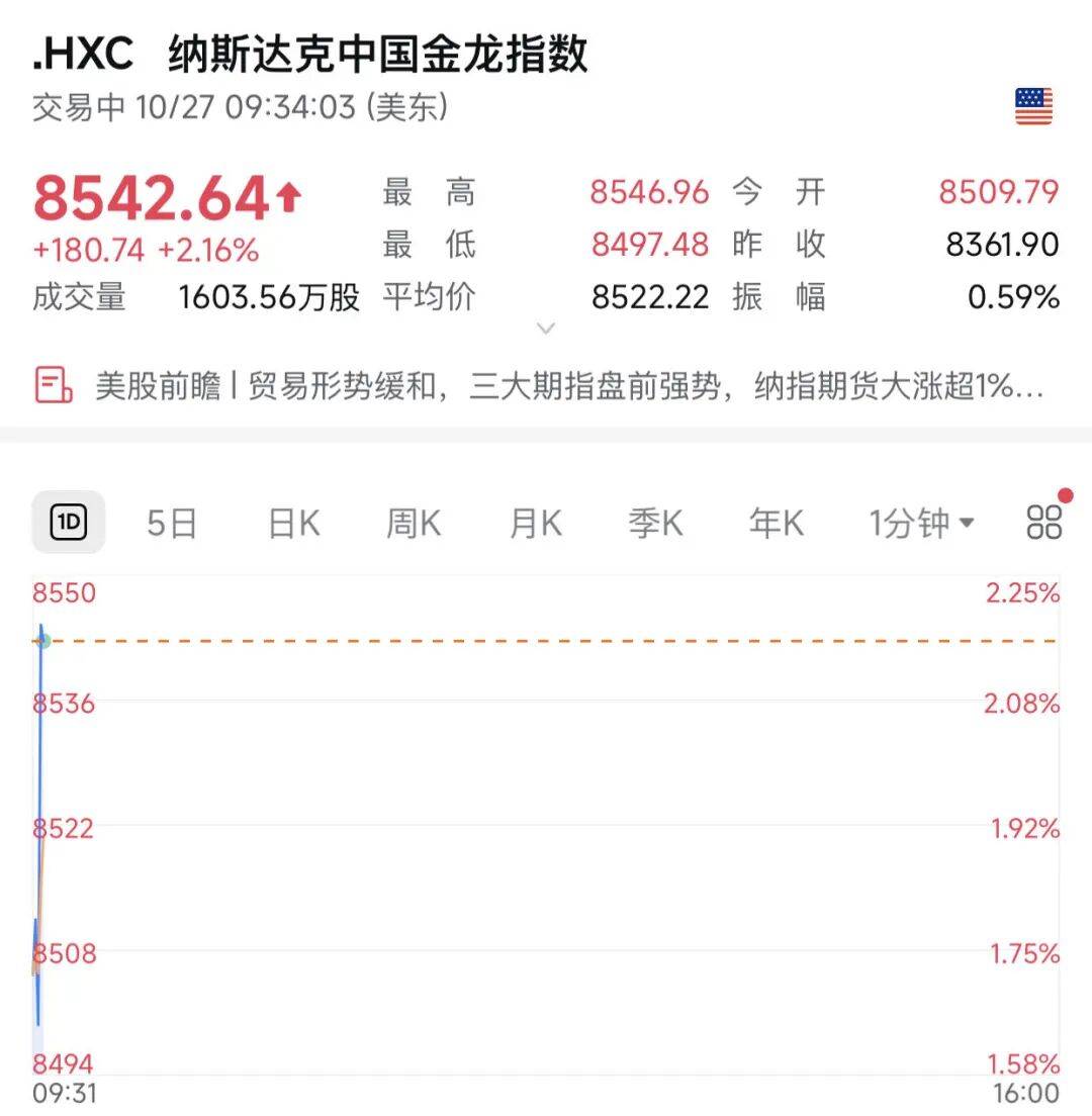 纳斯达克中国金龙指数早盘大幅拉升,截至发稿,该指数涨超2%。