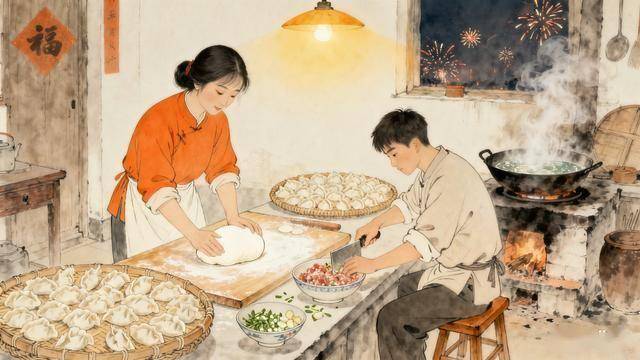 小两口围着灶台忙开了,阿芸和面,阿磊剁馅,葱姜切碎了拌进去,香味儿一下就飘满了小破屋。包好的饺子摆了满满一盖帘,个个肚大皮薄,看着就馋人。