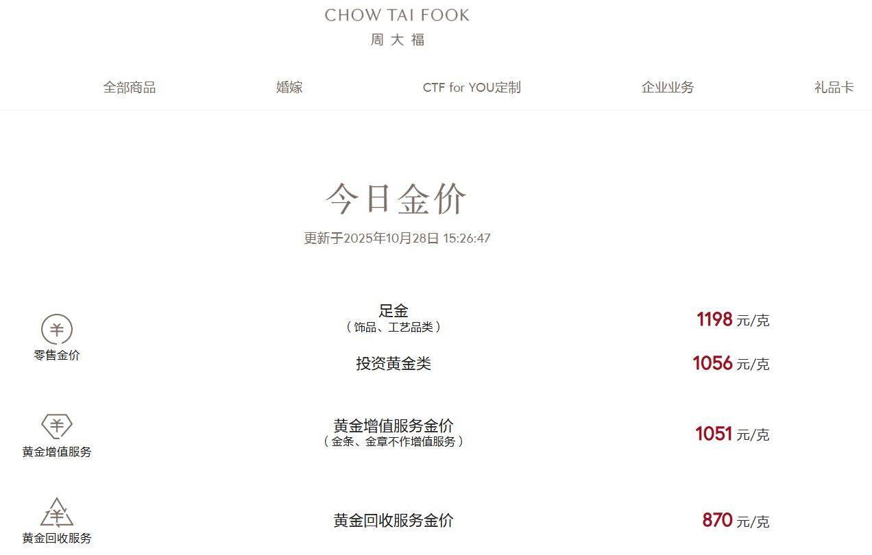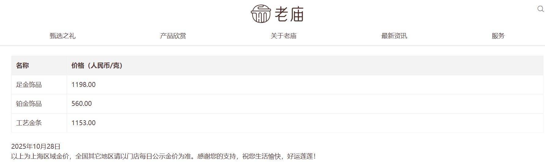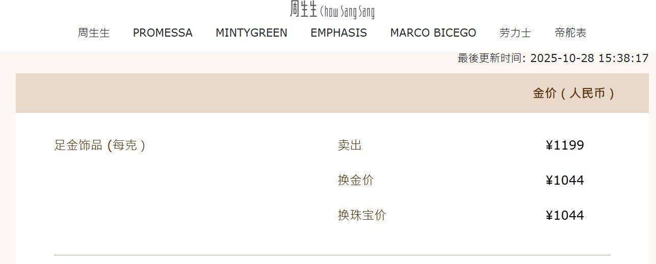 金饰品价格也出现下降。目前,周大福足金(饰品、工艺品类)价格为1198元/克,周生生足金饰品价格为1199元/克,老庙足金饰品价格为1192元/克。