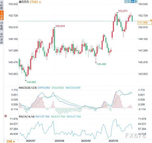 美元兑日元在月度波动高点153.25-153.30区域附近受阻回落,令多头需保持警惕。