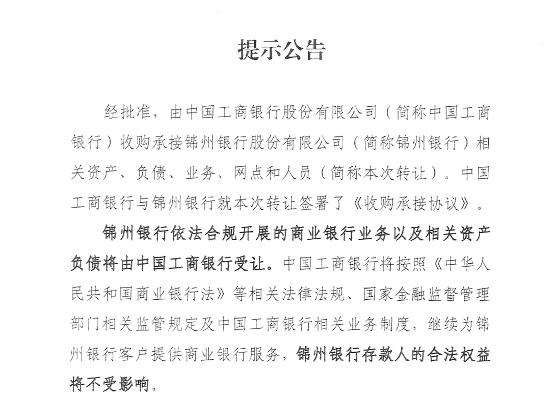 10月26日,锦州银行官网一则重磅公告,为这家走过28年风雨的区域性银行画上了阶段性句点——经监管批准,中国工商银行(601398)将正式收购承接锦州银行全部相关资产、负债、业务、网点及人员,双方已签署《收购承接协议》。