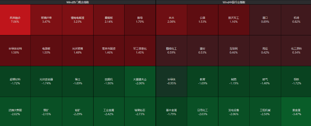 盘面上,个股跌多涨少,全市场超2900股飘绿。今日全市场成交逾2.16万亿,沪深两市成交额2.15万亿,较上一个交易日缩量近2000亿。板块方面,福建海西板块连续两日爆发,军工股午后逆势走强,玻纤、覆铜板、电路板概念表现活跃;有色行业普跌,黄金、稀土跌幅居前,光伏、煤炭板块萎靡。