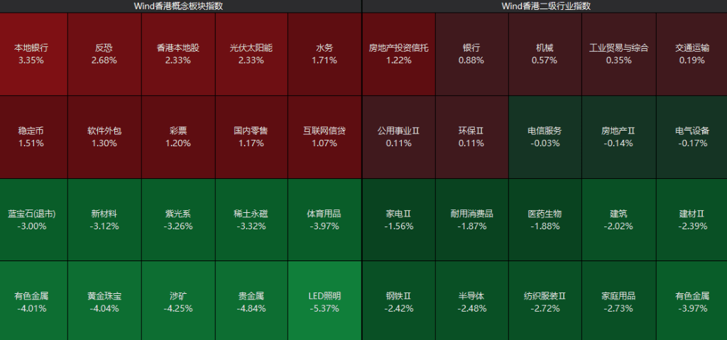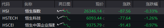 港股:截至收盘,恒指高开低走收跌0.33%,恒生科技指数跌1.26%。