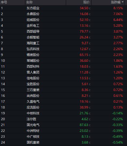 可控核聚变概念股持续活跃,截至收盘东方钽业涨超8%,永鼎股份、纽威股份、金杯电工等涨幅居前。
