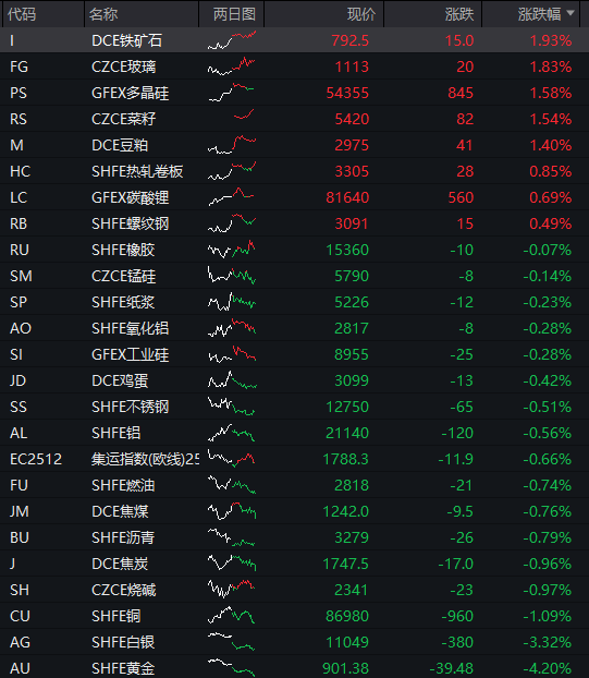债市方面,国债期货大幅反弹,30年期主力合约一度涨超0.8%。商品方面,国内商品期货多数上涨,受到国际黄金、白银下跌影响,沪金大跌超4%,沪银跌超3%。