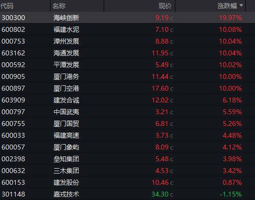 福建板块持续爆发,相关概念股掀起涨停潮,平潭发展强势录得“8天6涨停板”,路桥信息录得30%涨停,海峡创新录得20%涨停,福建水泥、厦门空港、厦门港务等10余只个股涨停。