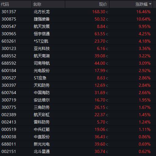 军工板块午后持续走强,截至收盘,北方长龙涨16%,捷强装备、航天发展、恒宇信通等纷纷走高。