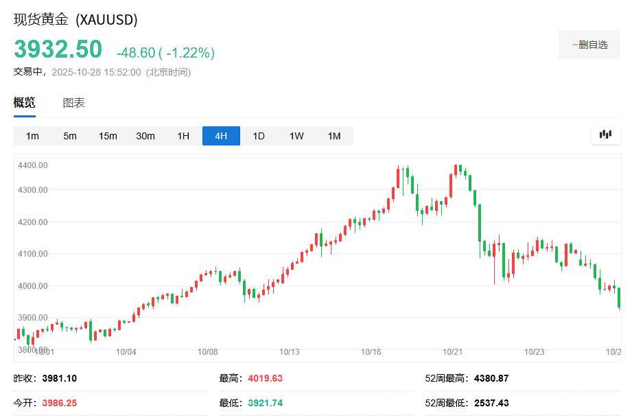 消息面,继隔夜跌破4000美元关口之后,现货黄金今天亚市盘中持续下跌,截止发稿,最低跌至3920美元附近。
