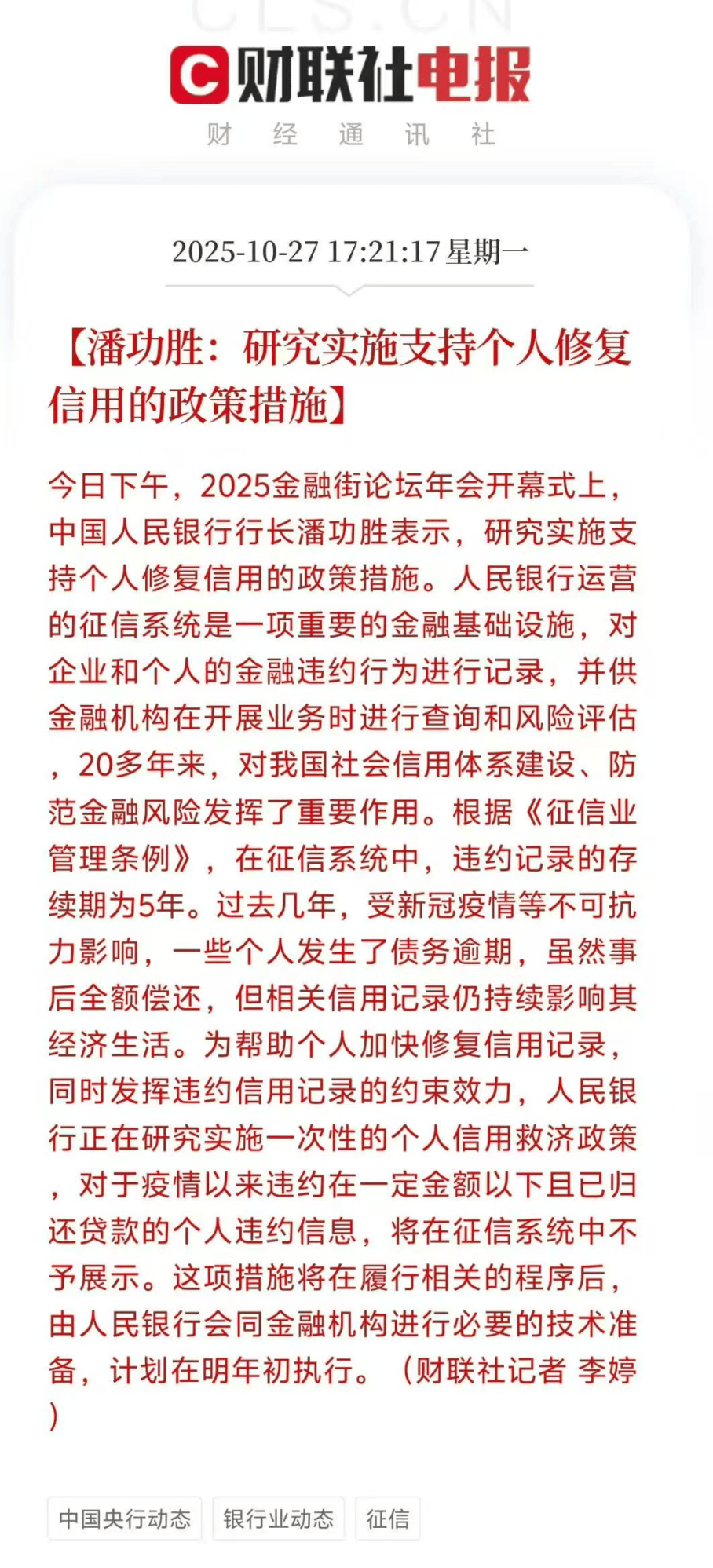 昨天,中国人民银行行长潘功胜,在2025金融街论坛年会开幕式上表示:研究实施支持个人修复信用的政策措施!