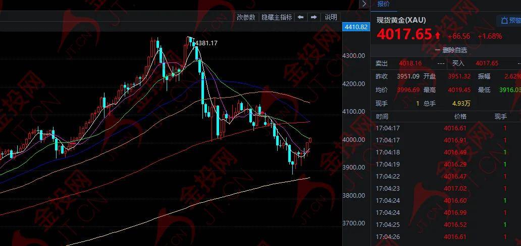 隔夜,现货黄金延续回调态势,跌破4000美元心理关口,最低触及3886美元,随后小幅回升至3922美元附近。今日欧市盘中,黄金小幅上涨,目前在4018美元附近徘徊。