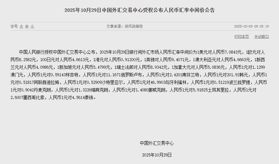 10月29日,据中国人民银行官网消息, 人民币兑美元中间价上调13个基点,报7.0843。Wind数据显示,10月29日, 在岸人民币对美元开盘小幅上涨,报7.1000,前一交易日16时30分收盘报7.1006。截至9时30分,离岸人民币对美元报7.09655。