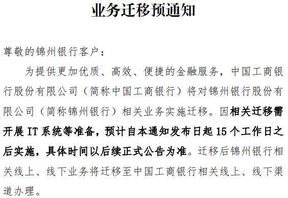 在业务迁移的具体安排上,工商银行对锦州银行的业务承接将分步骤进行。由于需要开展IT系统等准备工作,业务迁移将自通知发布之日起15个工作日之后实施。迁移业务范围涵盖对公业务和个人业务:对公业务包括单位银行结算账户业务、企业网上银行、支票业务、代发工资业务;个人业务包括支付结算业务、代销基金业务。