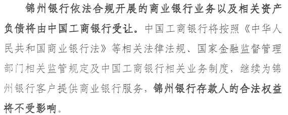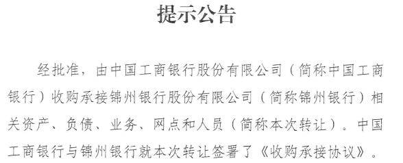 2025年10月26日,锦州银行正式公告,由工商银行收购承接其相关资产、负债、业务、网点和人员。