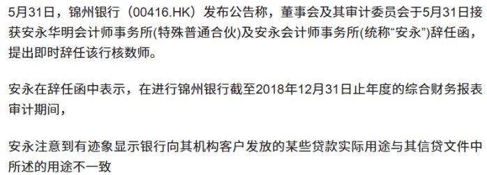 然而,快速发展的背后隐藏着严重隐患。2019年,锦州银行风险爆发,不仅2018年年报难产,且安永会计师事务所辞任该行审计机构。据《澎湃新闻》报道,安永在辞任函中表示,在进行审计期间,注意到有迹象显示银行向其机构客户发放的某些贷款实际用途与其信贷文件中所述的用途不一致。