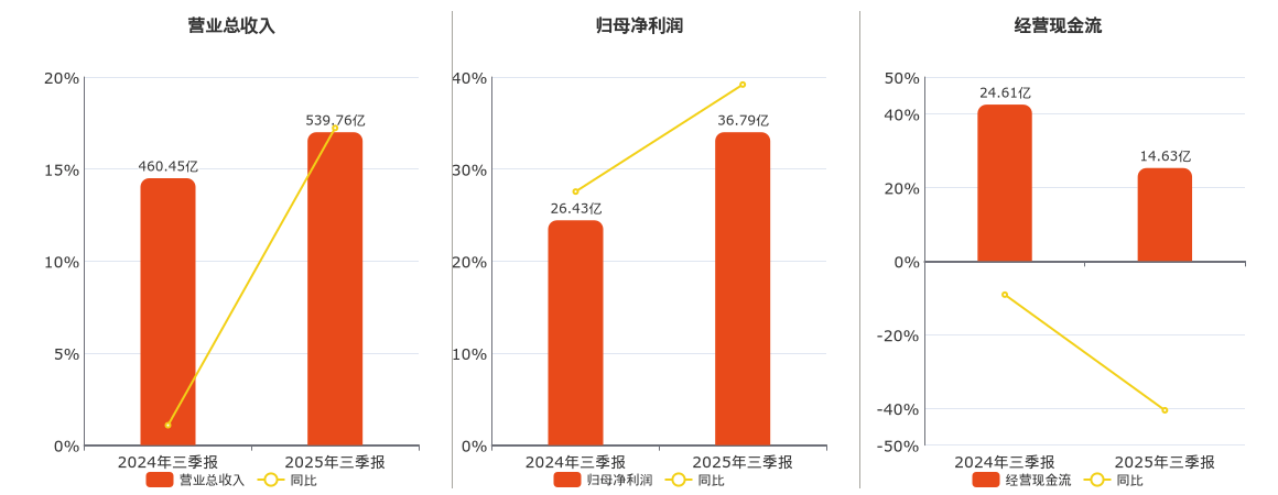公司营业总收入为539.76亿元,在已披露的同业公司中排名第3,较去年同报告期营业总收入增加79.31亿元,实现3年连续上涨,同比较去年同期上涨17.23%。归母净利润为36.79亿元,在已披露的同业公司中排名第2,较去年同报告期归母净利润增加10.36亿元,实现5年连续上涨,同比较去年同期上涨39.18%。经营活动现金净流入为14.63亿元,在已披露的同业公司中排名第4。