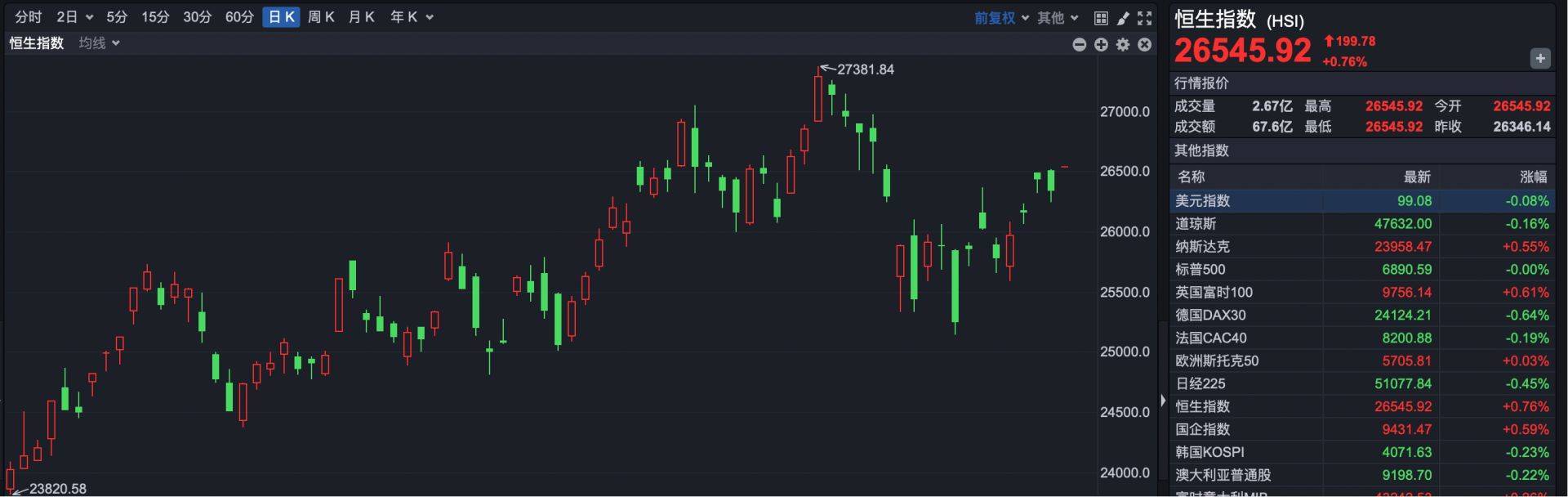 截至发稿,恒生指数开盘报26545.92点,上涨199.78点,涨幅0.76%。