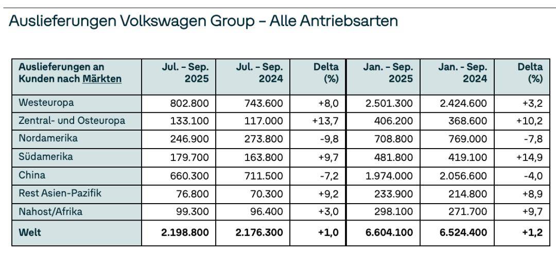 2025年第三季度,大众汽车集团共交付汽车219.9万辆,同比增长1.0%。从增长动力来看,部分具体车型在全球市场表现出色,为交付量增长做出了贡献。不过,这样的增长幅度在全球汽车市场快速发展的当下,显得有些不尽人意。细分品牌来看,大众品牌销量117.2万辆,同比下滑0.4%;斯柯达为25.63万辆,同比增长15.1%;奥迪同比下滑2.6%,为39.22万辆;保时捷同比下滑5.7%,为6.61万辆;细分市场来看,大众在西欧销量为80.28万辆,同比增长8.0%;中欧和东欧同比增长13.7%,为13.31万辆;北美洲同比下滑9.8%,为24.69万辆;南美洲为17.97万辆,同比增长9.7%;
