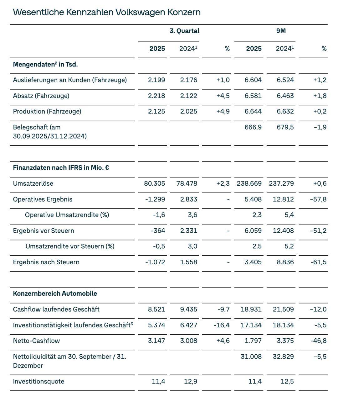 10月30日,大众汽车集团发布2025年第三季度财报显示,2025年第三季度实现营业收入803.05亿欧元,同比增长2.3%;营业亏损12.99亿欧元,上年同期营业利润28.33亿欧元;息税前利润为亏损3.64亿欧元,同期利润为23.31亿欧元;税后利润为亏损10.72亿欧元,同期为15.58亿欧元。从数据不难看出,虽然大众汽车营收实现增长,但是却在盈利方面面临巨大的严峻挑战。