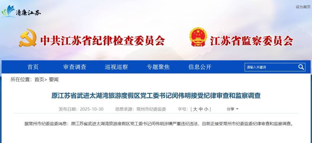 江苏省纪委监委官网10月30日援引常州市纪委监委消息:原江苏省武进太湖湾旅游度假区党工委书记闵伟明涉嫌严重违纪违法,目前正接受常州市纪委监委纪律审查和监察调查。