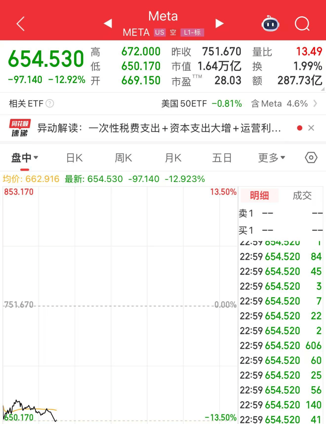 美股科技股多数下跌,截至发稿,微软跌超3%,亚马逊跌超1%。Meta股价开盘暴跌,截至发稿跌近13%,报654.53美元/股,总市值为1.64万亿美元(截至10月29日美股收盘,Meta总市值为1.89万亿美元)。