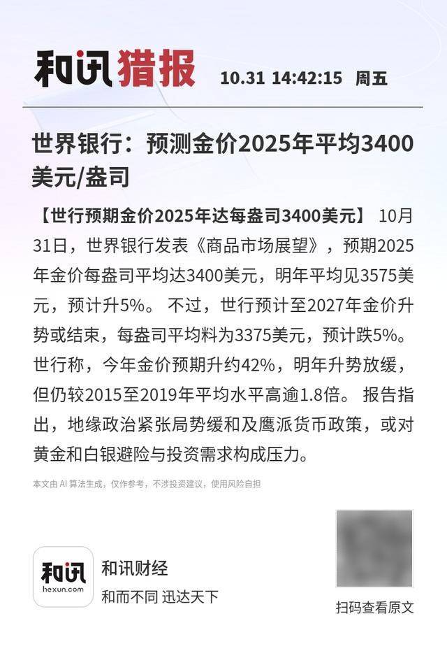 【世行预期金价2025年达每盎司3400美元】10月31日,世界银行发表《商品市场展望》,预期2025年金价每盎司平均达3400美元,明年平均见3575美元,预计升5%。 不过,世行预计至2027年金价升势或结束,每盎司平均料为3375美元,预计跌5%。 世行称,今年金价预期升约42%,明年升势放缓,但仍较2015至2019年平均水平高逾1.8倍。 报告指出,地缘政治紧张局势缓和及鹰派货币政策,或对黄金和白银避险与投资需求构成压力。