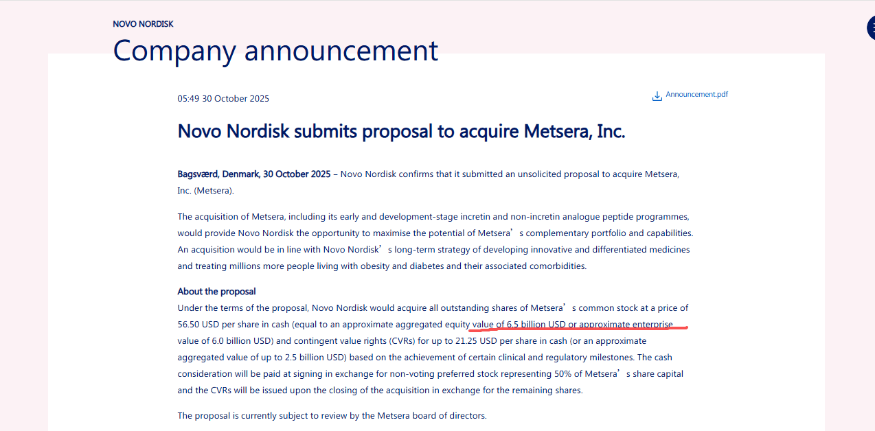 诺和诺德回应,高价收购Metsera可以最大化其产品组合,发掘其应用潜力。收购计划符合诺和诺德开发创新和差异化药物的长期战略。