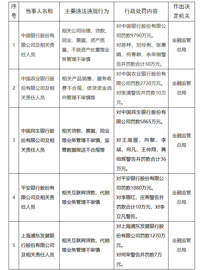 国家金融监督管理总局今日发布行政处罚公告,中国银行、农业银行、民生银行、平安银行、浦发银行五家金融机构领受大额罚单,罚款金额合计超过2亿元。