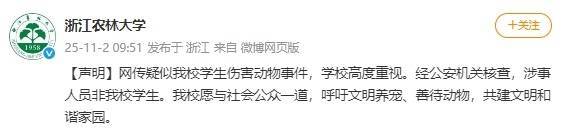 【声明】网传疑似我校学生伤害动物事件,学校高度重视。经公安机关核查,涉事人员非我校学生。我校愿与社会公众一道,呼吁文明养宠、善待动物,共建文明和谐家园。