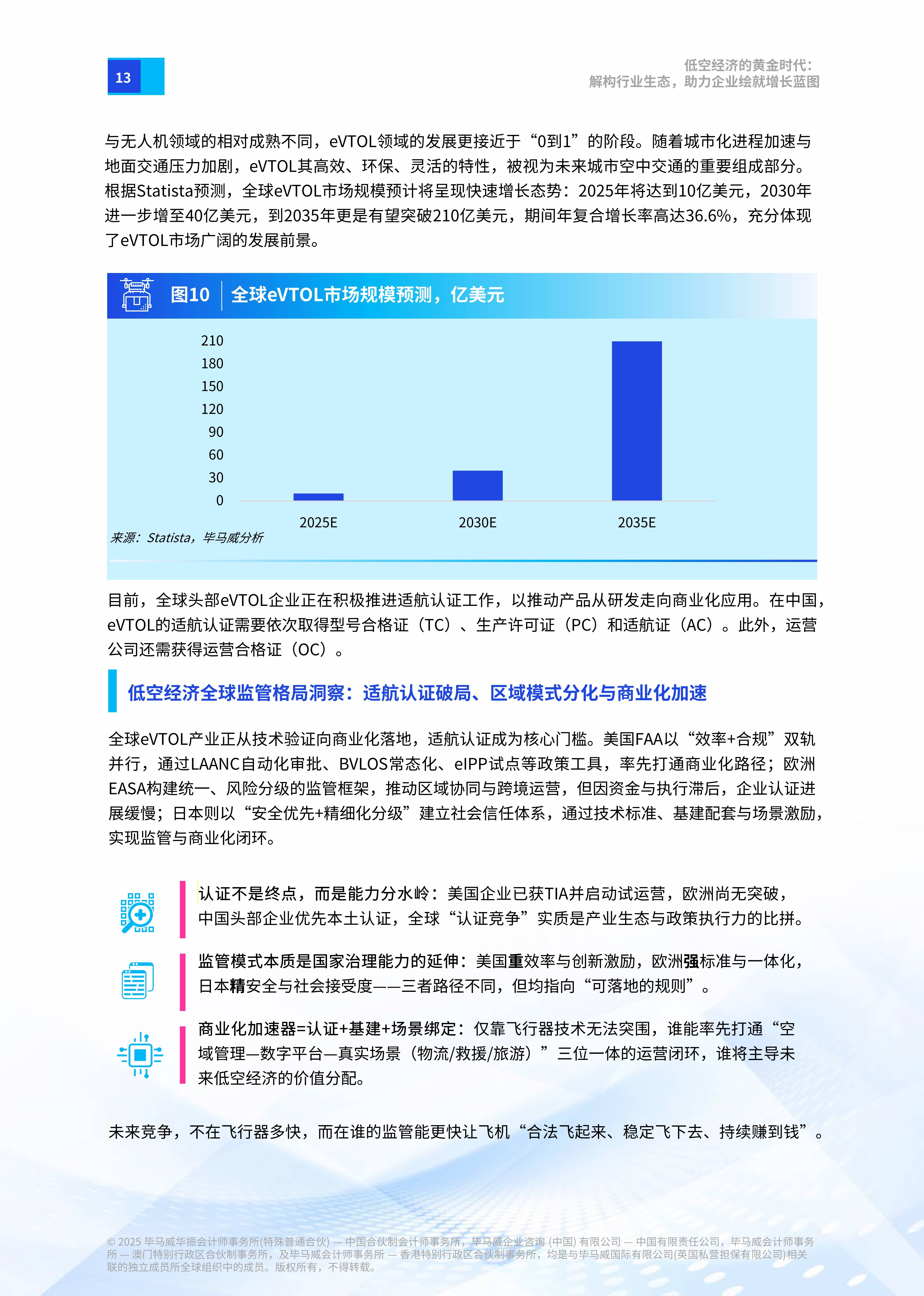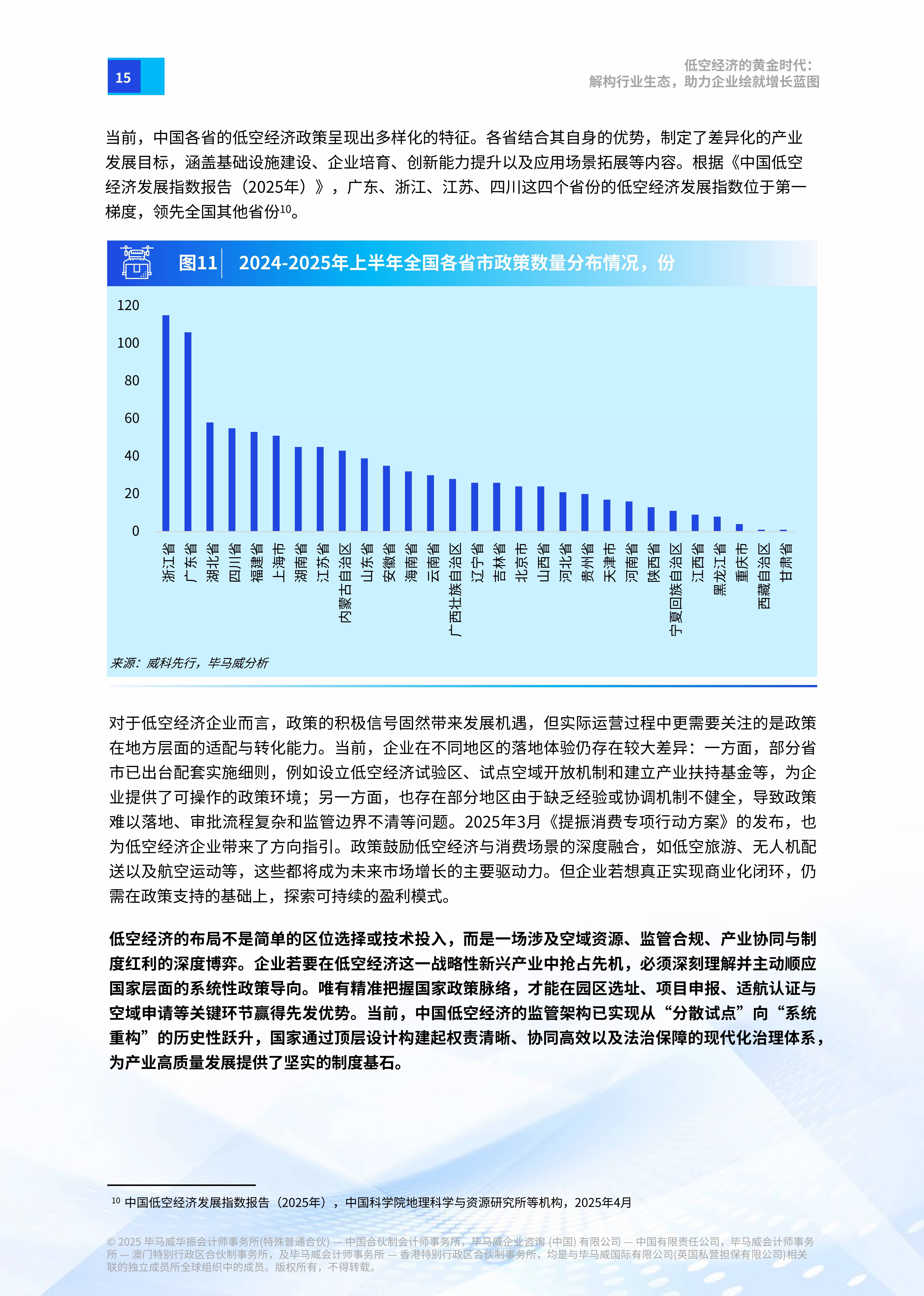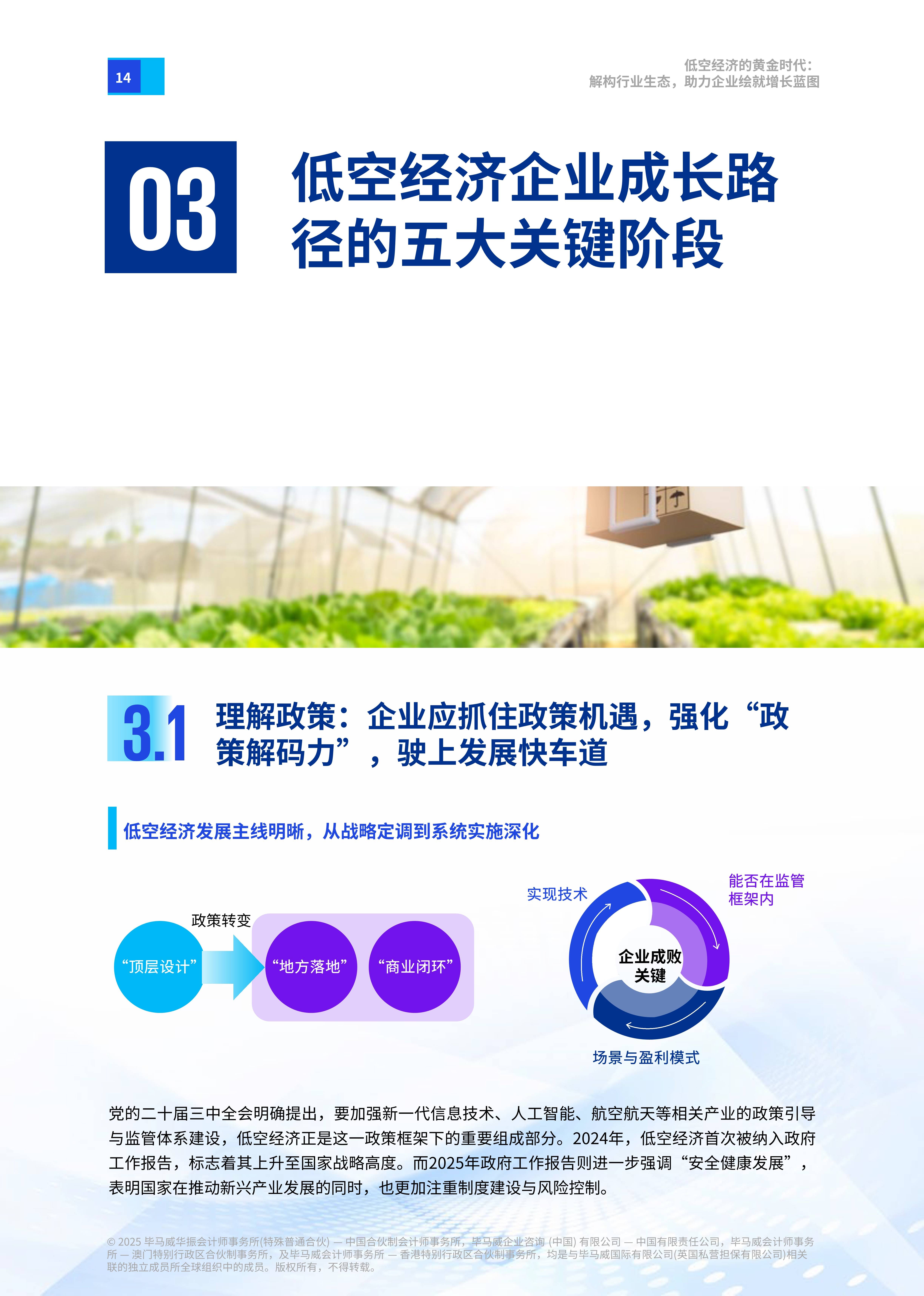 报告分析了全球低空经济发展概况,指出国外低空经济从应用探索到标准化建设,再到全面推广,而中国低空经济则从萌芽起步迈入快速发展期。中国低空经济产业链已覆盖基础材料、核心部件、系统集成、运营服务等环节,国产化率超85%。报告还指出,低空经济企业成长路径包括理解政策、产业链构建、赛道聚焦、资本入局和开拓海外等五大关键阶段。中国低空经济企业数量从2015年的2.85万家增至2024年的8.8万家,规模扩张逾两倍。企业经营模式呈现专业化深耕与适度多元并行的特点,支持与应用服务成为延伸核心。