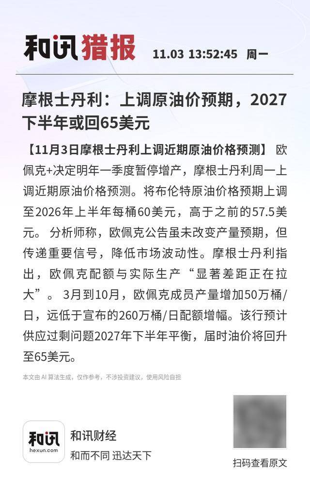 【11月3日摩根士丹利上调近期原油价格预测】欧佩克+决定明年一季度暂停增产,摩根士丹利周一上调近期原油价格预测。将布伦特原油价格预期上调至2026年上半年每桶60美元,高于之前的57.5美元。 分析师称,欧佩克公告虽未改变产量预期,但传递重要信号,降低市场波动性。摩根士丹利指出,欧佩克配额与实际生产“显著差距正在拉大”。 3月到10月,欧佩克成员产量增加50万桶/日,远低于宣布的260万桶/日配额增幅。该行预计供应过剩问题2027年下半年平衡,届时油价将回升至65美元。