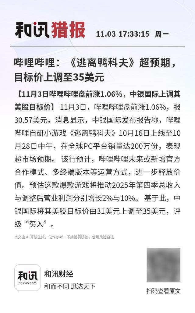 【11月3日哔哩哔哩盘前涨1.06%,中银国际上调其美股目标价】11月3日,哔哩哔哩盘前涨1.06%,报30.57美元。消息显示,中银国际发布报告称,哔哩哔哩自研小游戏《逃离鸭科夫》10月16日上线至10月28日中午,在全球PC平台销量达200万份,表现超市场预期。该行预计,哔哩哔哩未来或新增官方合作模式、多终端版本等运营方式,进一步释放价值。预估这款爆款游戏将推动2025年第四季总收入与调整后营业利润分别增长2%与10%。基于此,中银国际将其美股目标价由31美元上调至35美元,评级“买入”。