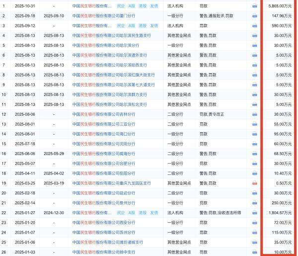 将时间线拉长来看,民生银行2025年以来的合规表现令人担忧。据统计,仅在2025年一季度,民生银行罚没金额就超2000万元,在股份制银行中位居首位。