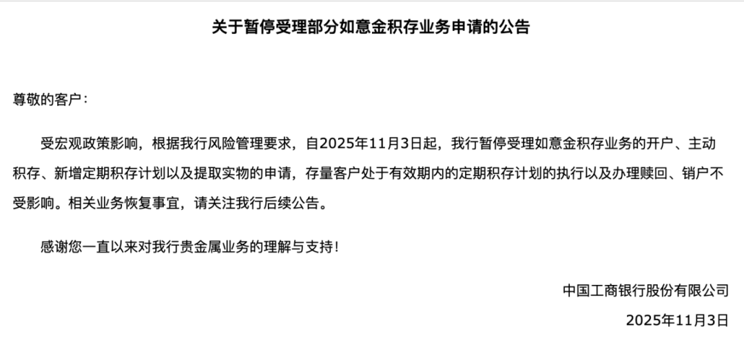 工商银行3日发布公告称,受宏观政策影响,根据工商银行风险管理要求,自2025年11月3日起,工商银行暂停受理如意金积存业务的开户、主动积存、新增定期积存计划以及提取实物的申请,存量客户处于有效期内的定期积存计划的执行以及办理赎回、销户不受影响。