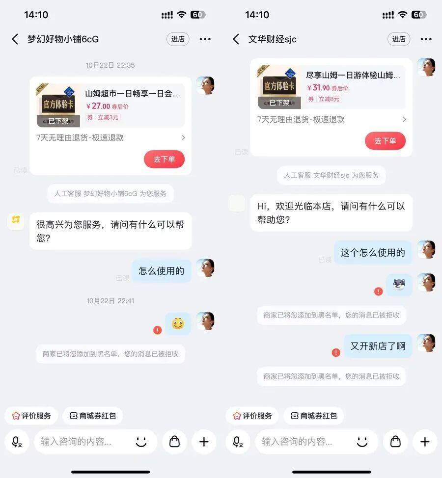 钟女士也在购买山姆超市体验卡后被盗刷,而就在被骗后的第2天,她发现,关掉了一家店,更多家店在平台上冒出来。而她联系新店铺的客服询问“如何使用”,多家店铺的客服都没有回复,而是直接将她拉黑。钟女士也由此意识到,这些源源不断涌出的店铺似乎是同一伙人。