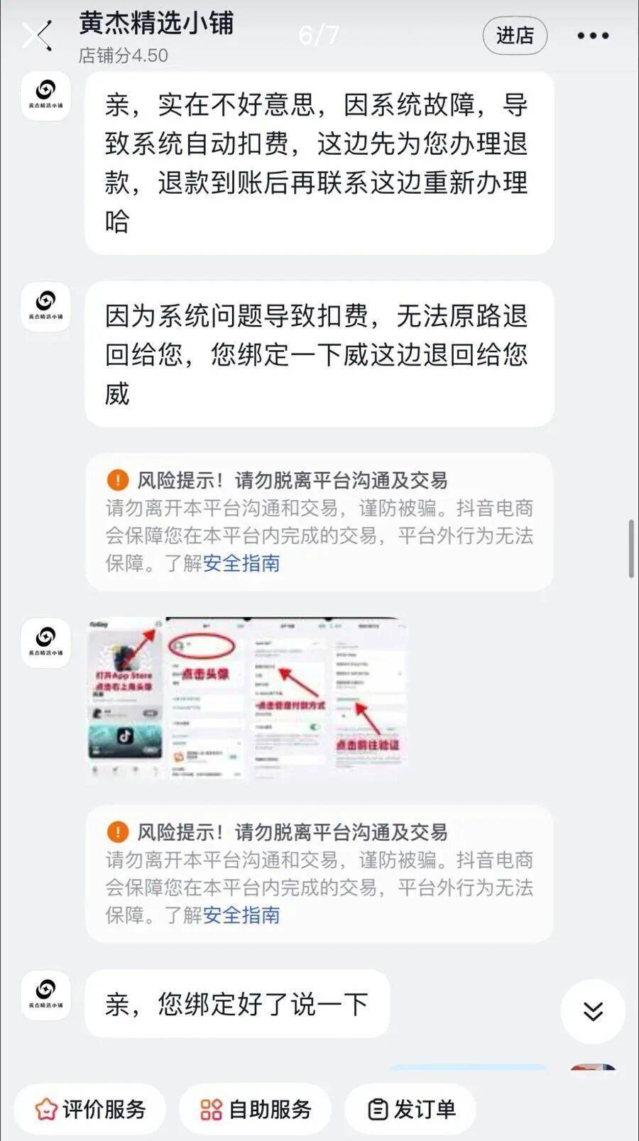 10月11日,广西的谭女士在抖音商城购买了山姆会员一日卡,下单后,名为“黄杰精选小铺”店铺的客服给她发送了一张充值流程图。图中显示,需要她提供苹果账户的账号和密码,客服表示“需要使用苹果商店礼品券开通”,并反复强调“过程中您无需退出账户,无需担心隐私问题”。