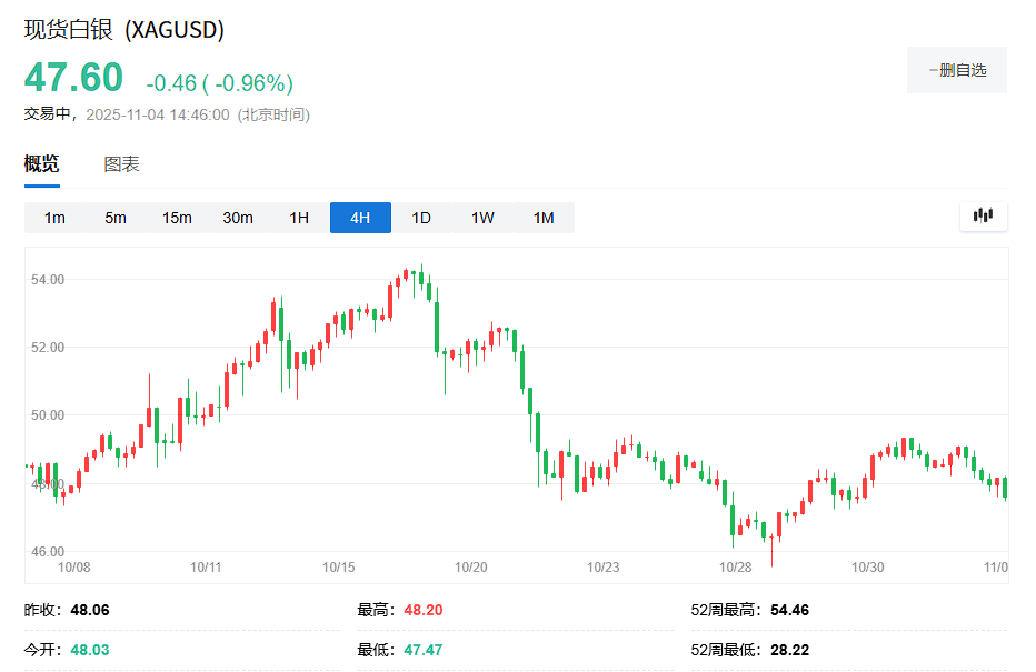 黄金连续第三日走低,现货黄金跌至3970美元;现货白银日内跌幅达1%,报47.57美元/盎司;