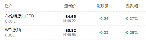 国际油价走低,WTI原油跌0.38%,布伦特原油跌0.37%。