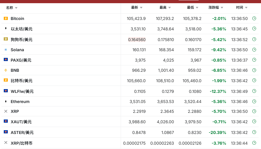 加密货币普跌,比特币下跌2%至10.46万美元,以太坊近3%至3500美元