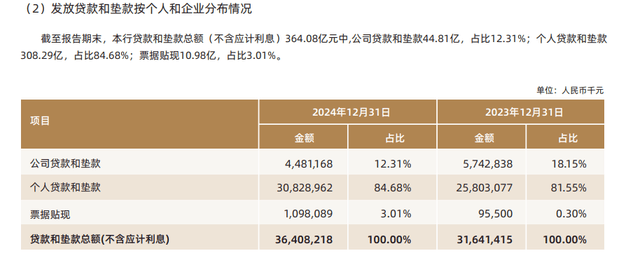 从财务数据来看华瑞银行的个人贷款业务在信贷业务中的占比正在逐步增长,截至2024年末,该行贷款和垫款总额为364.08亿元。其中,个人贷款余额为308.29亿元,较2023年末增加19.48%,占贷款和垫款总额的84.68%。